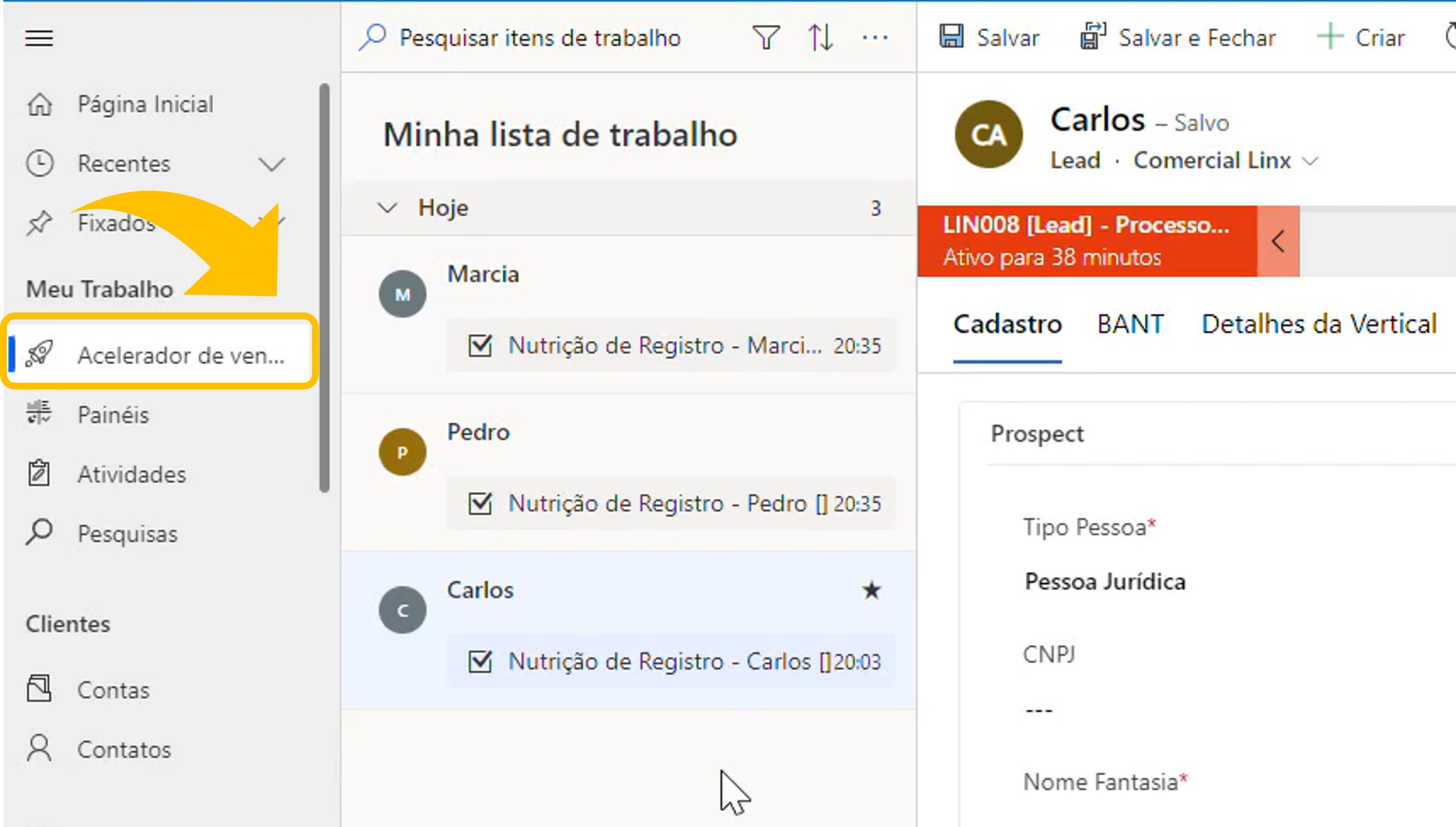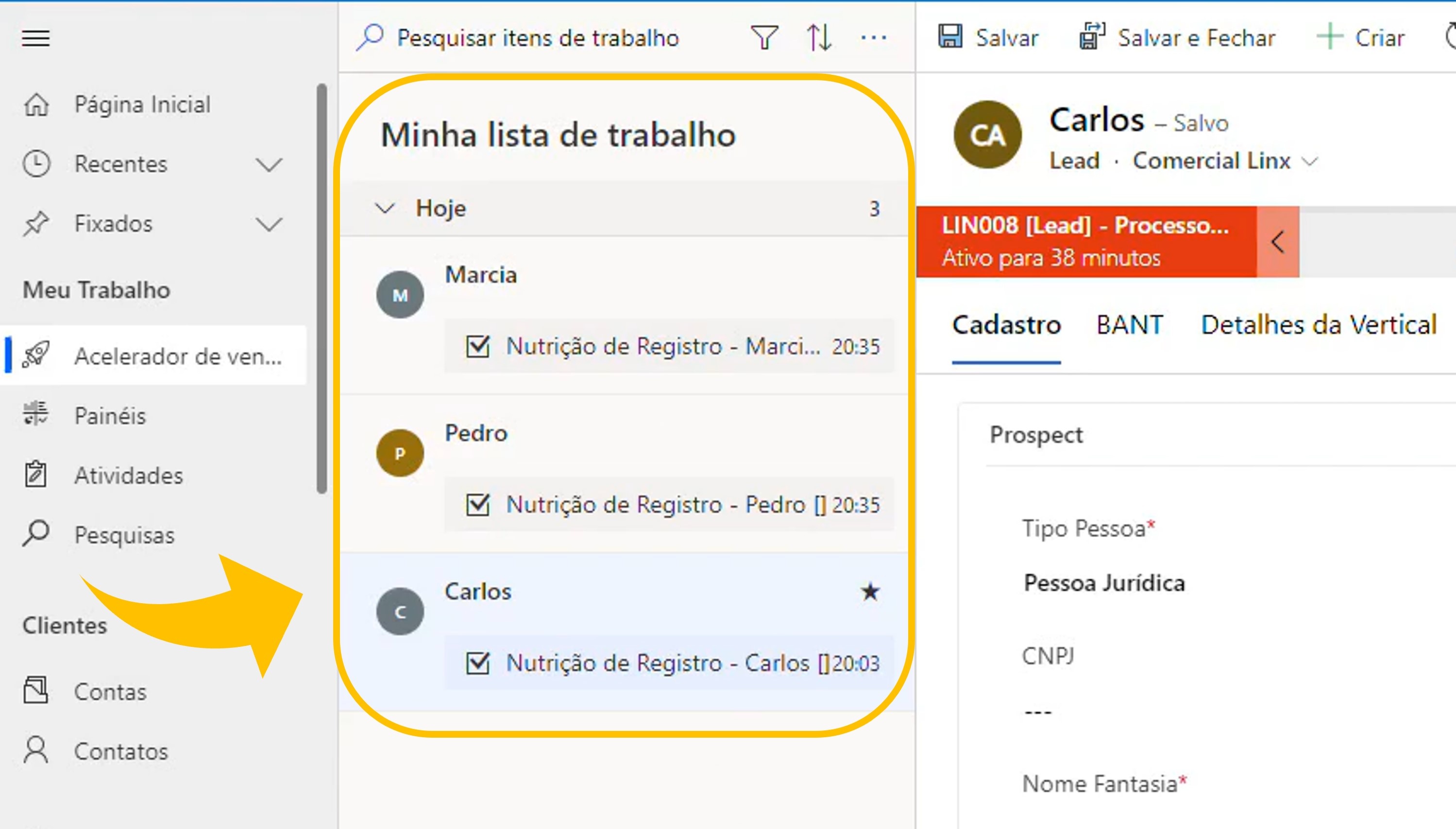 2. Em "Minha lista de trabalho" irá aparecer todas as atividades atreladas ao seus Leads e OPs, e ao clicar diretamente em um dos registros é possível abrir a tela de cada Lead e OP sem sair do acelerador.
