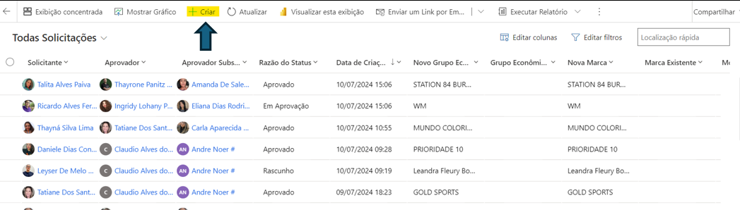 Na plataforma DYNAMICS, dentro da entidade GRUPO x MARCA, clique em + CRIAR para realizar o cadastro de um grupo e/ou marca novo.