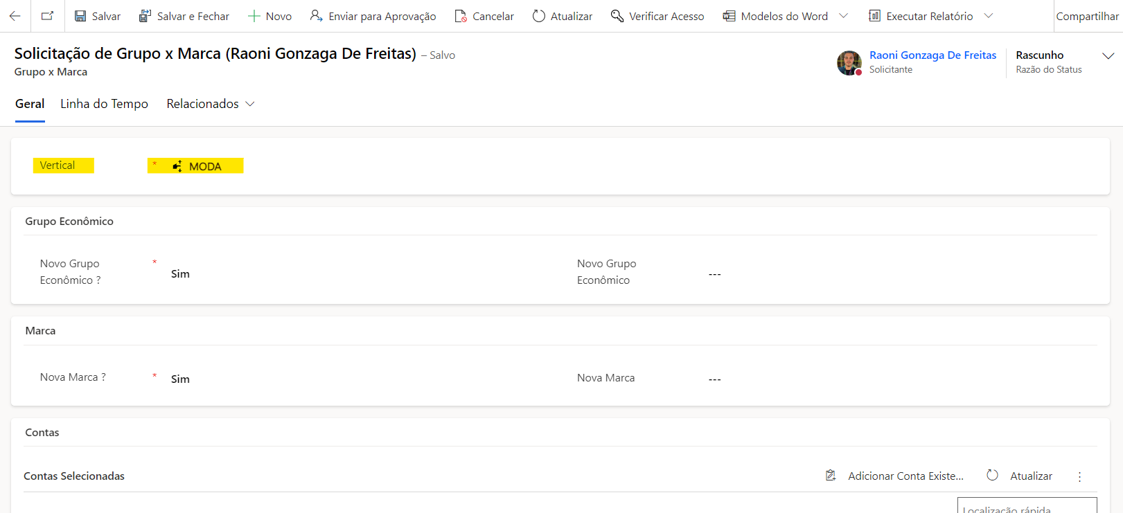 Trata-se da vertical a qual essa Conta pertencerá. Se o usuário está criando uma nova Conta, cuja a Marca ou Grupo já faz parte da carteira de MODA, mesmo que seja para vender um produto Cross, o correto é que seja preenchido a Vertical MODA.