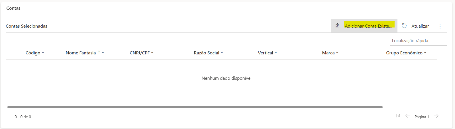 Em seguida, adicione 1 ou mais CNPJ's , clicando em “Adicionar contas existente” que deseja inserir o grupo e marca.