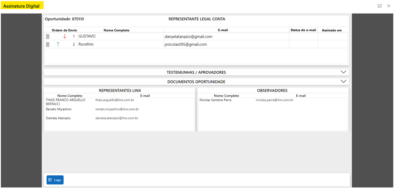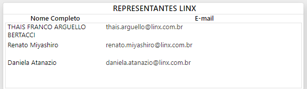 Já em representantes Linx estão listados como já é hoje, o Diretor da Vertical Signatário e a Gerente de Sustentação Comercial. *Exemplo de tela:
