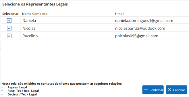 Todos os contatos da conta que estão como Repres.Legal, Resp.Tec/ Rep. Legal ou Decisor/ Tec/ Legal irão aparecer disponíveis, na parte superior e entre eles pode-se: