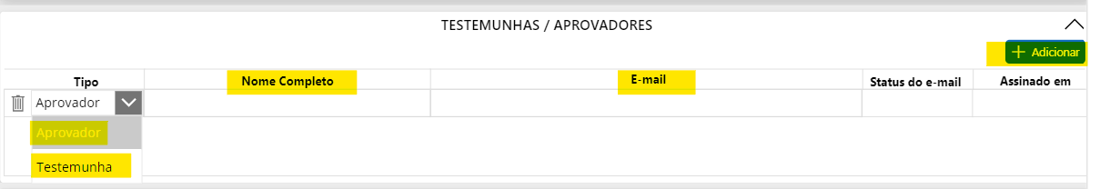 Depois é preciso escolher entre Testemunha e Aprovador, e preencher o nome completo e e-mail do contato. Caso seja necessário adicionar mais contatos basta realizar o mesmo processo.