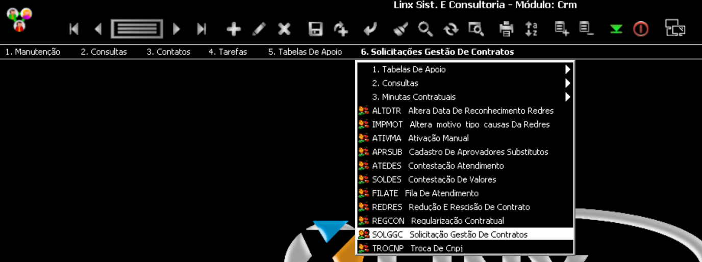 Para consultar a tela, abra o Visual Linx > clique na setinha verde > CRM