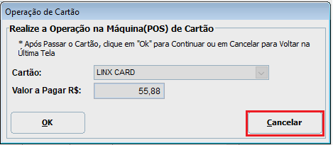 No momento que a tela abaixo é exibida, deve ser realizado o processo na máquina do cartão (POS), em seguida basta confirmar a operação clicando no "OK"