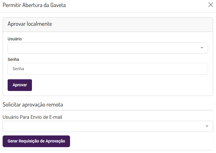 Ao selecionar "Sim" apresentará a tela para um supervisor aprovar naquele momento a abertura. Ou, inserindo um e-mail, poderá solicitar a abertura remotamente ao clicar em "Gerar Requisição de Aprovação".