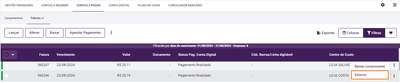 Acesse Menu > Adm./Financeiro > Gestão Financeira > Contas a Pagar > selecione a fatura e clique nos três pontinhos na linha dessa fatura, selecionando em seguida a opção "Estorno".