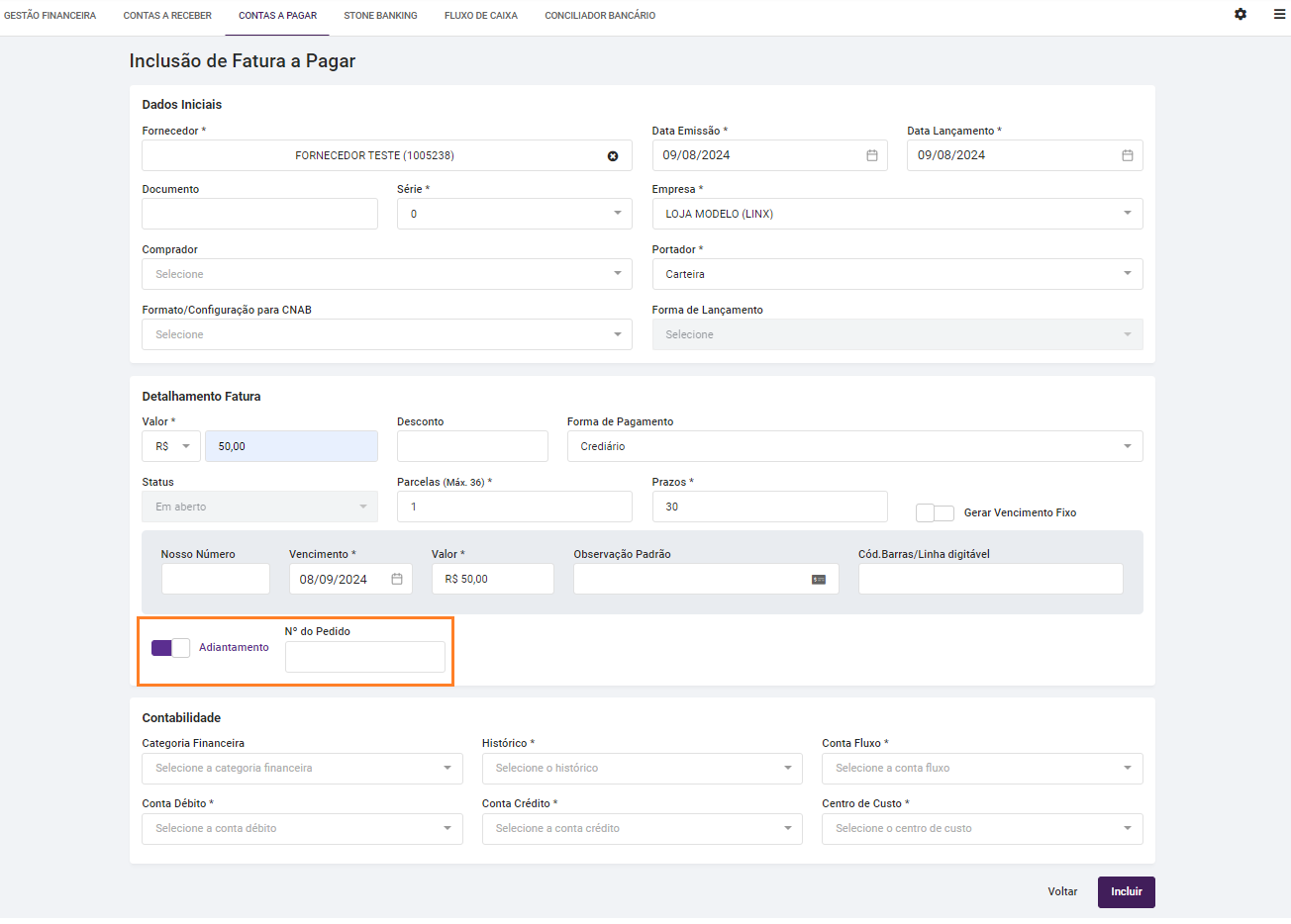 Ao lançar uma fatura a pagar, é possível sinalizá-la como um “Adiantamento”, além da possibilidade de inserir o nº do Pedido da compra ou venda em questão. Para isso, alguns itens devem ser levados em consideração, como: