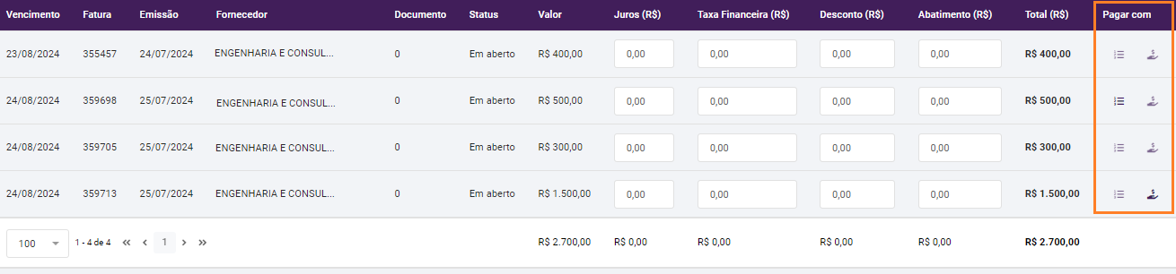 Detalhe da coluna "Pagar com" na Baixa de Faturas