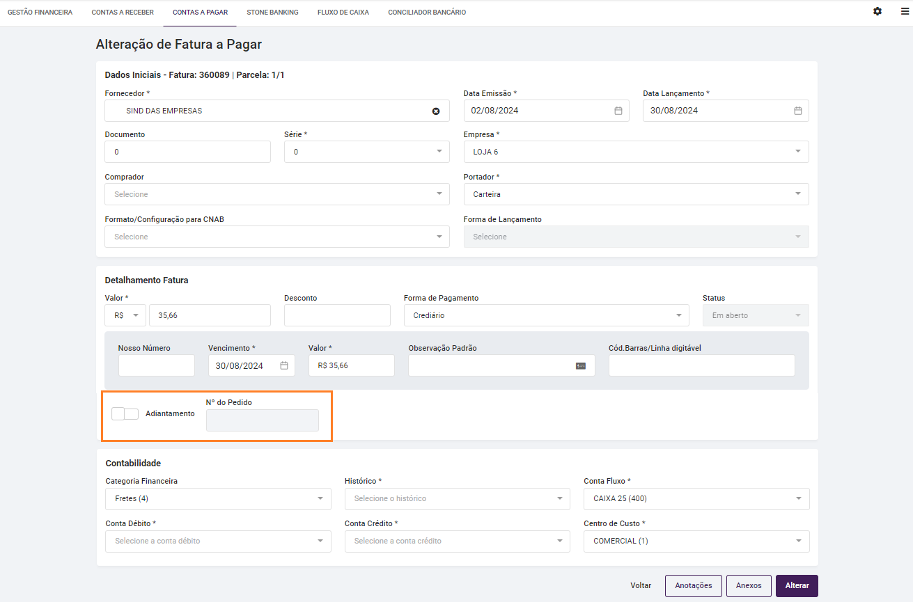 Acesse Menu > Adm./Financeiro > Gestão Financeira > Contas a Pagar > botão "Alterar". Ao realizar alterações em uma fatura a pagar, também é possível sinalizar se a fatura se refere à um Adiantamento, bem como incluir o nº do Pedido da compra ou venda em questão.