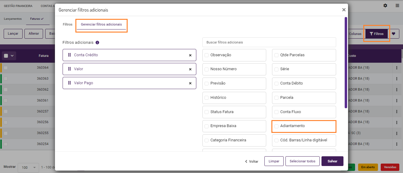 Detalhe do filtro de faturas com "Adiantamento"