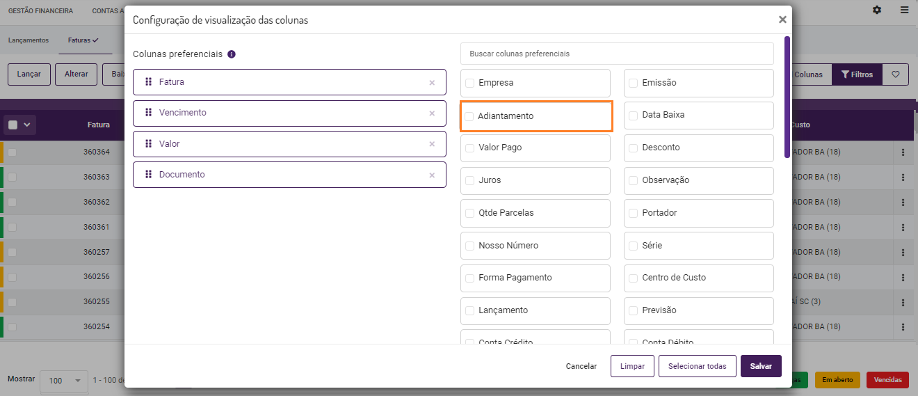 Ao configurar as colunas para visualizar o relatório, também é possível selecionar a coluna que exibirá informações de "Adiantamentos". Após selecioná-la, clique em "Salvar":