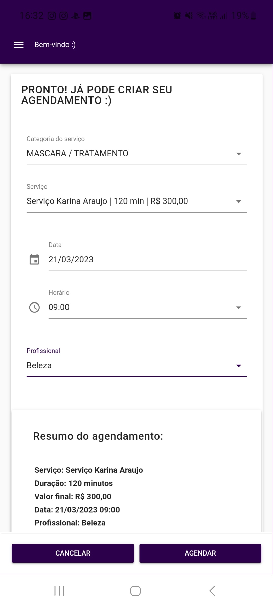 • Profissional: deverá selecionar qual profissional irá realizar o serviço;