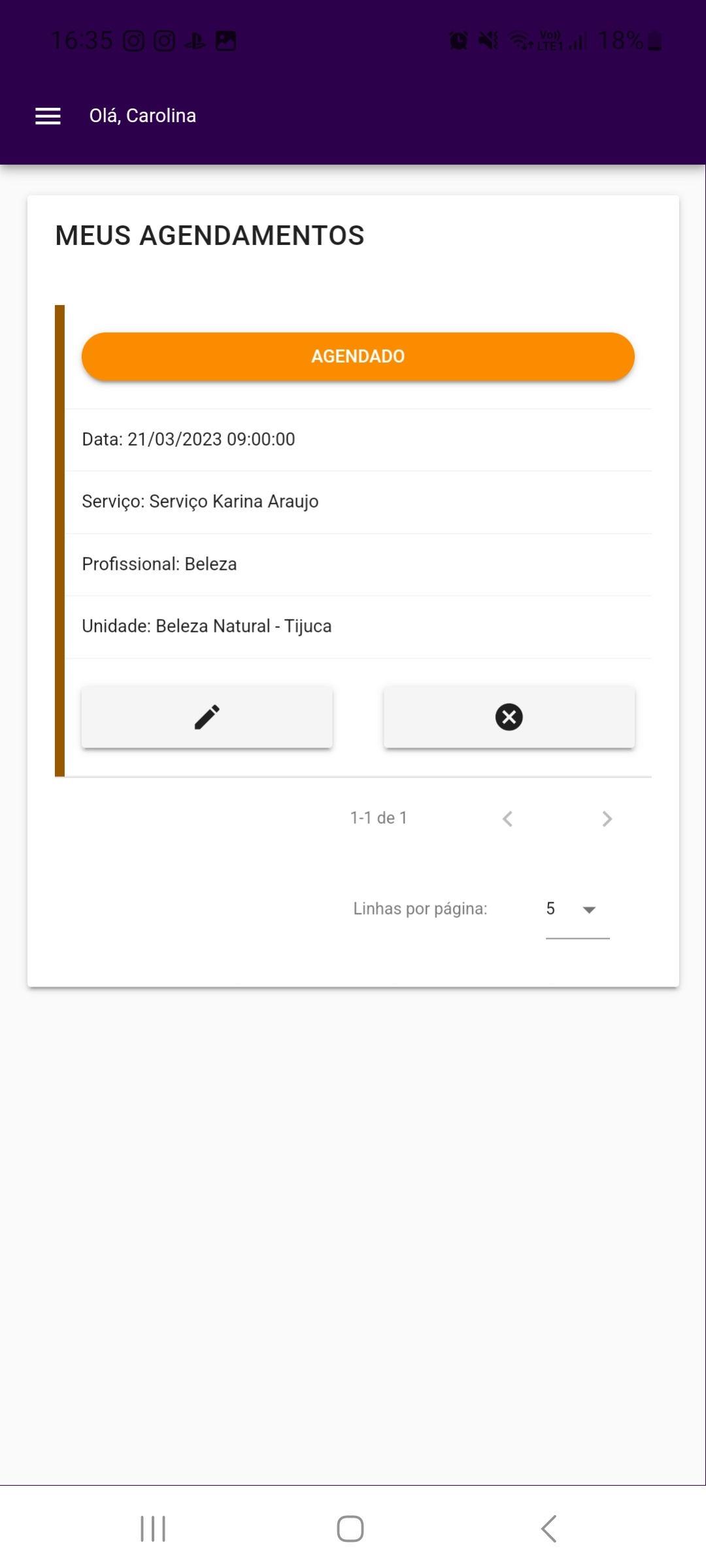 Na opção de Meus Agendamentos do menu o usuário poderá consultar os agendamentos realizados. O usuário poderá editar o agendamento no ícone , ou excluir no ícone .
