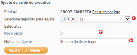 Clicando na opção    "Ajustar Saldo", será possível alterar o saldo do produto selecionando o depósito para o ajuste, informando o novo saldo e o motivo. Depois de confirmada a operação, um lançamento contábil será realizado conforme as operações padrões 25 - Entrada para Ajuste de Estoque (caso o saldo seja ajustado para uma quantidade maior) ou 58 - Saída para Ajuste de Estoque (caso o saldo seja ajustado para uma quantidade menor).