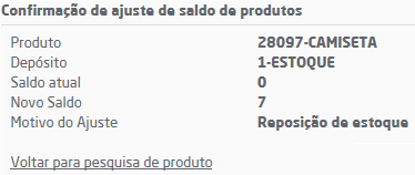 Após o ajuste de saldo será exibida a tela de "Confirmação de ajuste de saldo de produtos" com as informações da alteração realizada. Abaixo, ao clicar no link "Voltar para pesquisa de produtos", o sistema retornará à página de pesquisa, listando os resultados da busca realizada anteriormente.