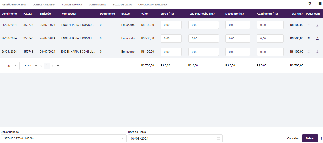 - Total: nesta coluna, é exibido o resultado do cálculo: Valor + Juros + Taxa Financeira - Desconto - Abatimento, para cada fatura, e vai sendo atualizado, na medida em que esses campos vão recebendo valores.