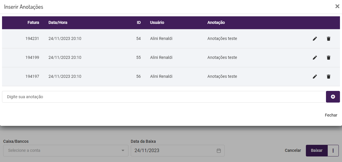 Ao clicar na botão dos 3 pontinhos , na parte inferior da tela, e em seguida na opção "Anotações", abrirá a tela "Inserir Anotações", e será possível listar, visualizar, incluir novas, editar e excluir anotações, das faturas que estão sendo baixadas.