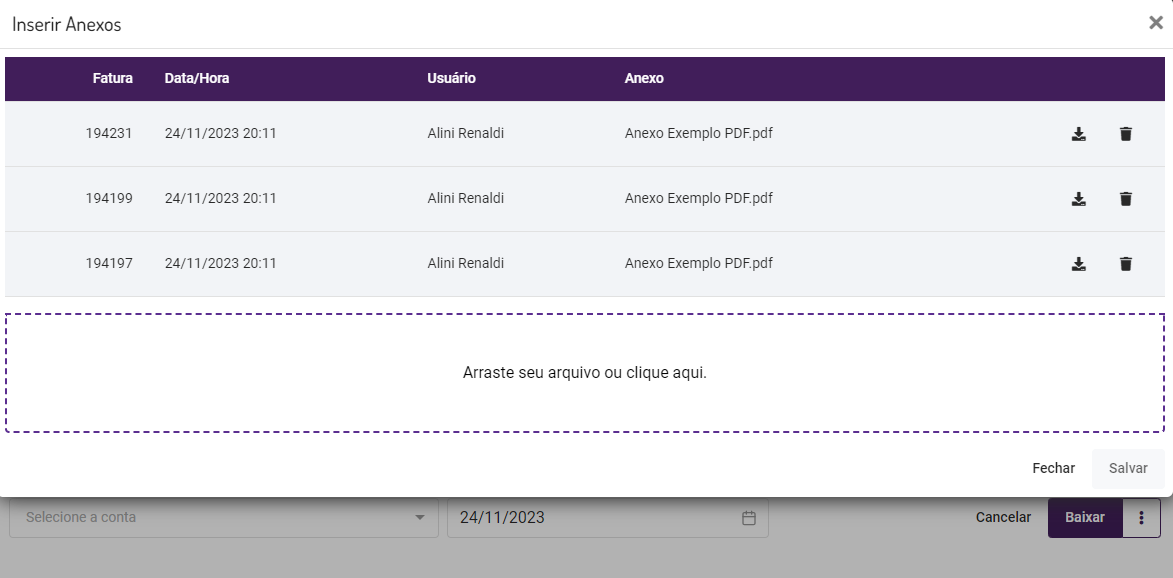 Ao clicar na botão dos 3 pontinhos , na parte inferior da tela, e em seguida na opção "Anexos", abrirá a tela "Inserir Anexo", e será possível visualizar a lista, incluir novos, baixar e excluir anexos, das faturas que estão sendo baixadas.