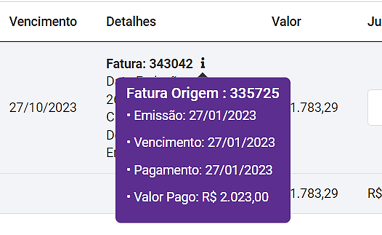 - Quando uma fatura for gerada a partir da baixa parcial de uma fatura de origem, ela exibirá o ícone na coluna Detalhes, e ao posicionar o mouse sobre esse ícone, será exibida informações sobre a fatura de origem.