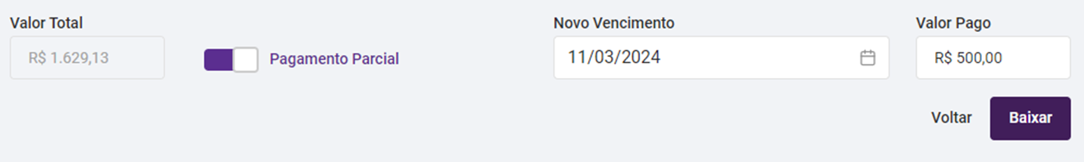 Caso queira realizar baixa parcial do valor, é necessário habilitar o botão "PAGAMENTO PARCIAL". Em seguida, defina a data do novo vencimento da fatura que ficara com o valor restante
