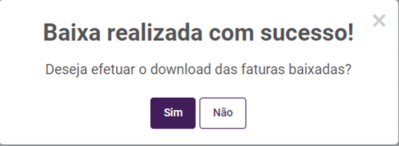 Ao concluir a realização da baixa da(s) fatura(s) de forma individual ou em lote, surgirá a opção para fazer ou não o download dos dados da(s) fatura(s) baixada(s) em uma planilha.