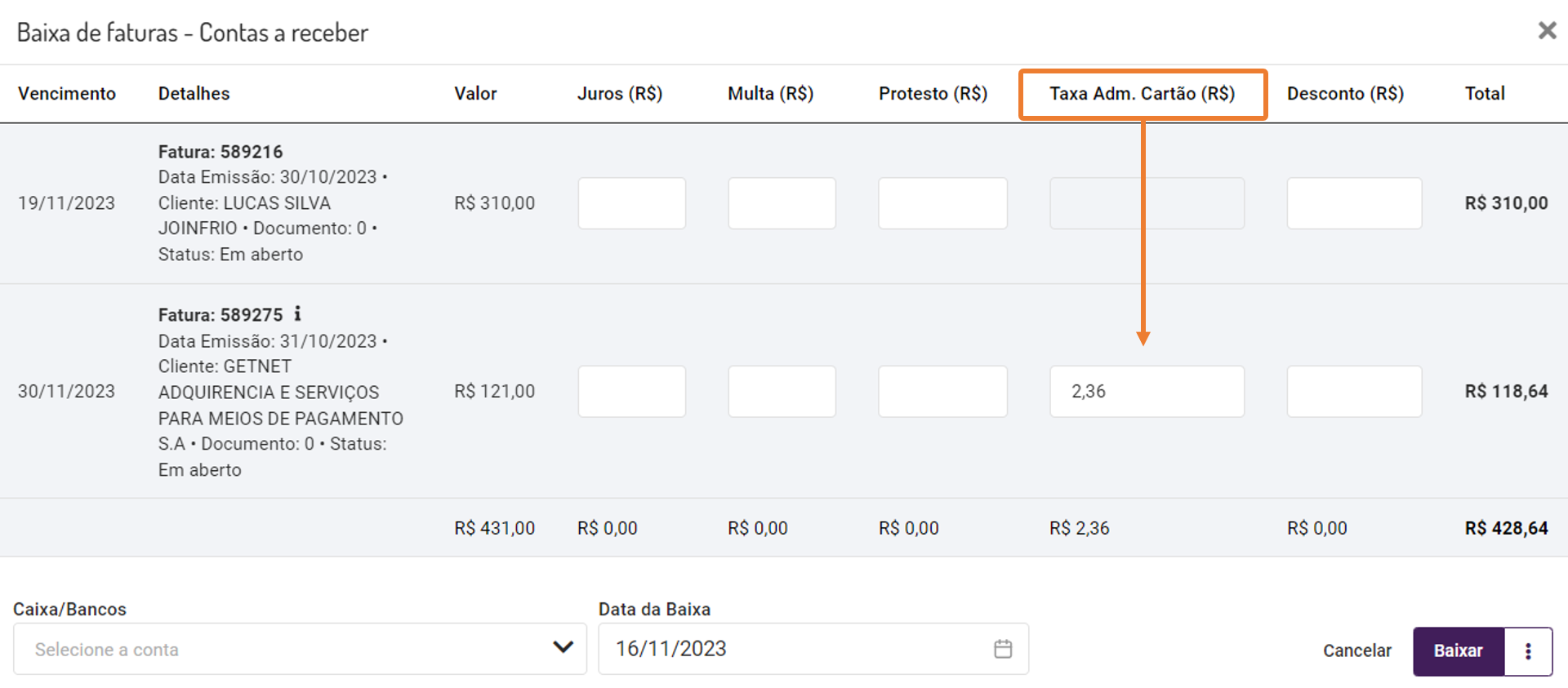 Na baixa de faturas, quando houver faturas definidas com a forma de pagamento "cartão", a coluna "Taxa Adm. Cartão (R$)" estará disponível na tela e somente estas faturas terão o campo disponível para edição.