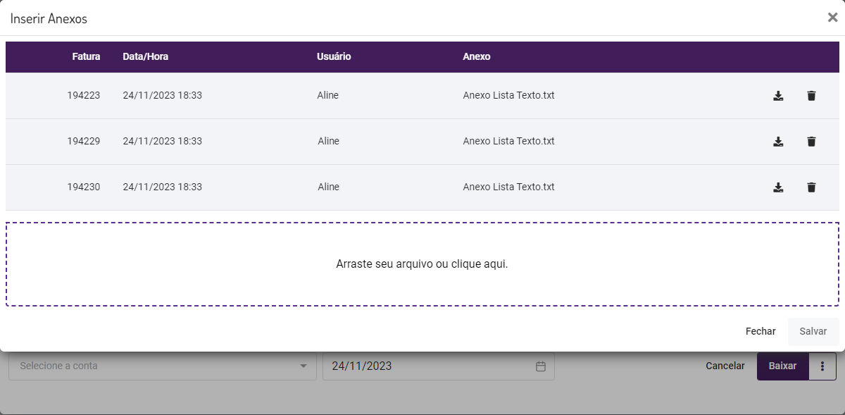 • Visualizar a lista de anexos já relacionados às faturas que estão sendo baixadas.