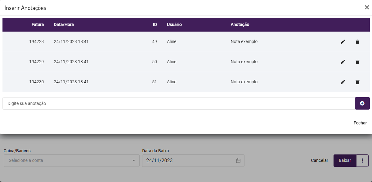 Essas opções permitem gerenciar as anotações de forma prática durante o processo de baixa das faturas.