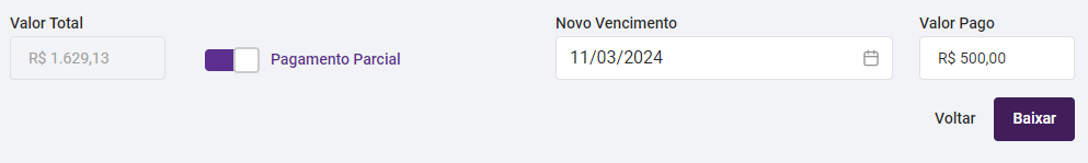 • Baixa Parcial: Caso seja parcial, será necessário habilitar o campo "Pagamento Parcial". Em seguida, defina a data do novo vencimento da fatura que ficará com o valor restante e defina o valor parcial que será pago agora. Neste caso, será gerada outra fatura com o valor restante, para a nova data de vencimento que ficou definida.