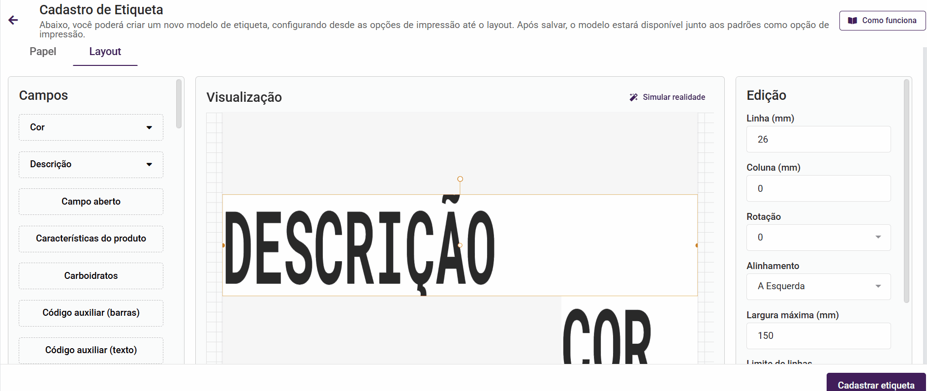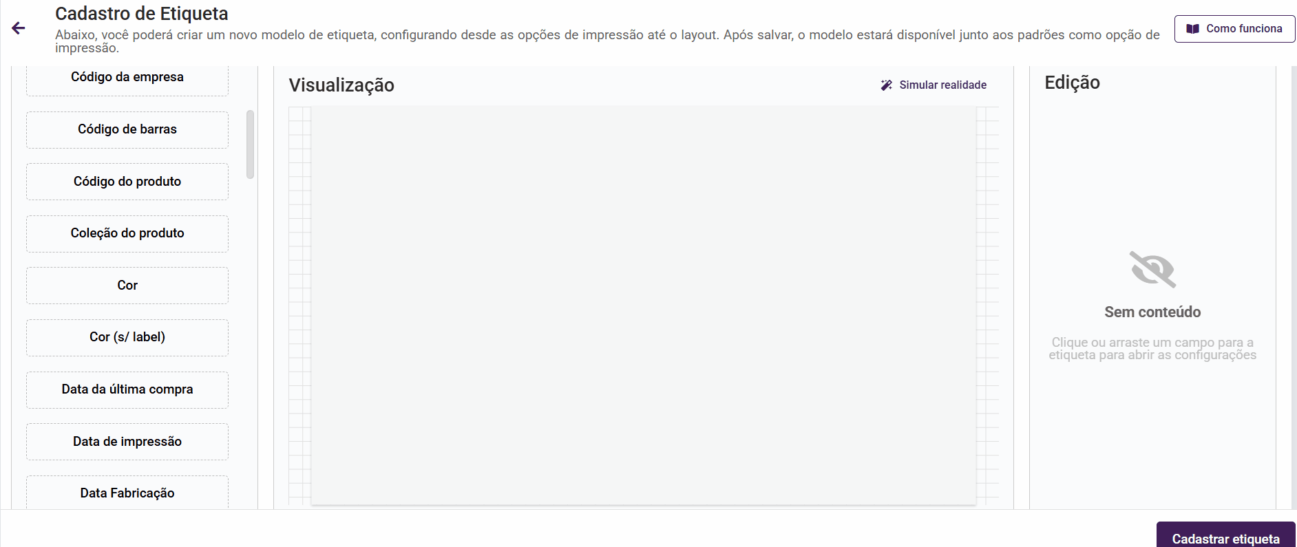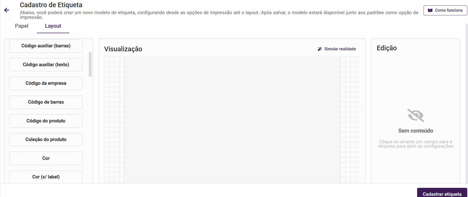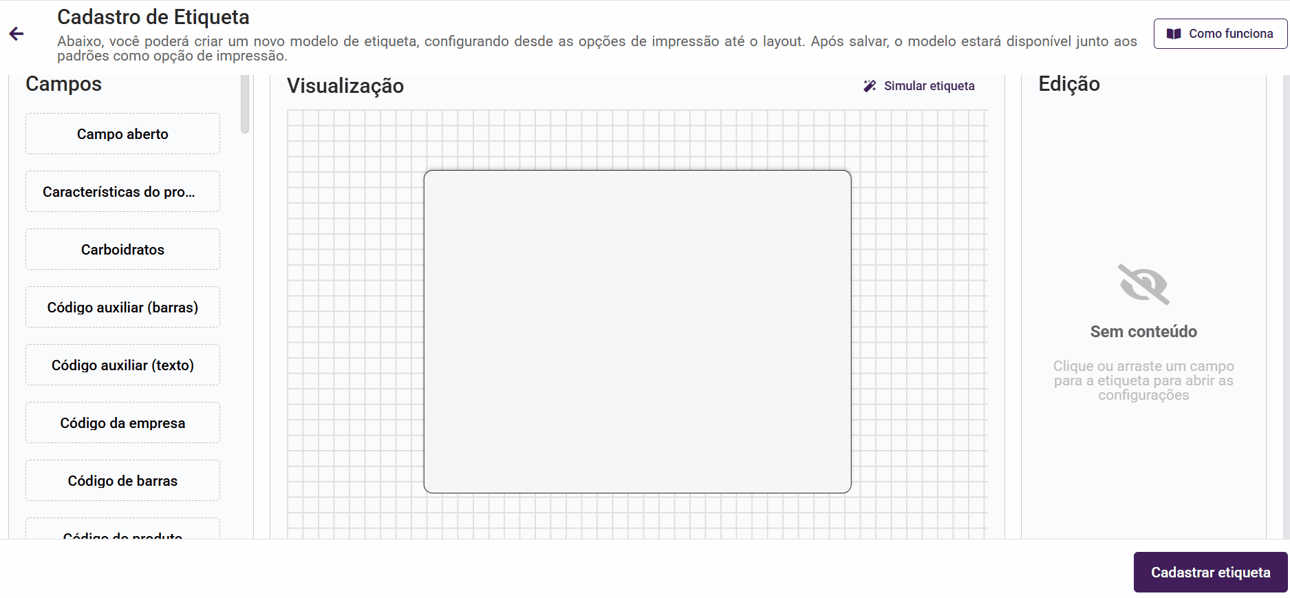 Ao terminar de configurar a etiqueta da forma como esperada, clique em Cadastrar etiqueta. A etiqueta será exibida na listagem e estará disponível para a impressão.