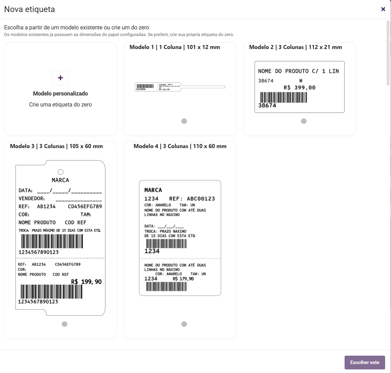 - Modelos que possuem as configurações básicas da etiqueta, como largura e altura da etiqueta, tipo de papel e o número de colunas.