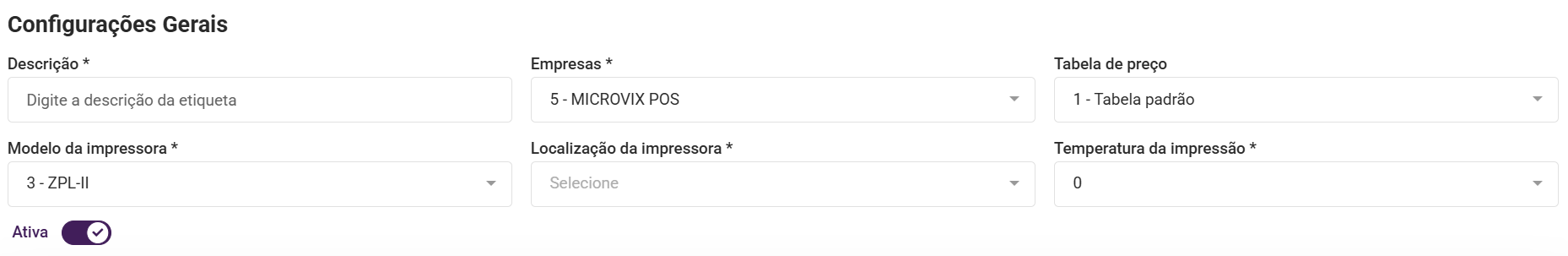- Ativa: para que o modelo de etiqueta possa ser utilizado, este campo deverá estar habilitado;