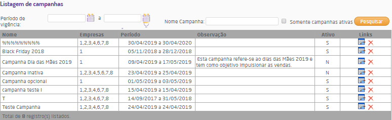 - Somente campanhas ativas: quando marcado, realiza a busca apenas de campanhas que estejam ativas;