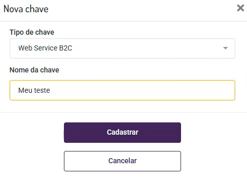- Ao selecionar a opção "Webservice B2C", e clicar em "Cadastrar", apenas uma chave deste tipo poderá estar ativa.