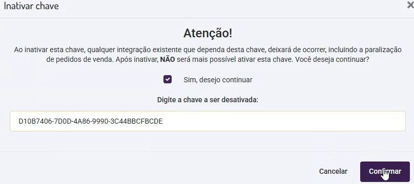 Também haverá uma opção de inativar uma chave escolhida pelo usuário, onde ao clicar no botão do lado direito da coluna "Status", haverá uma tela de confirmação, avisando que ao inativar uma chave, a mesma não poderá mais ser ativada novamente. Ao digitar o nome da chave e clicar em "Confirmar", a chave será inativada.