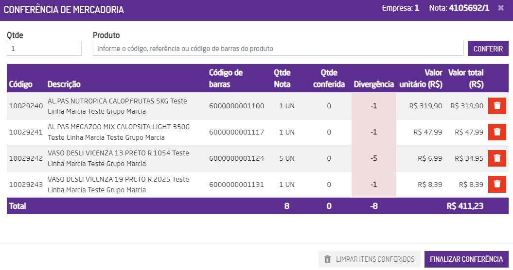 Para conferir os produtos insira o código, referência ou código de barras, e no campo Qtde defina a quantidade do produto que deverá ser conferido. Em seguida selecione o botão "Conferir". O produto passará para conferido, eliminando a divergência existente.