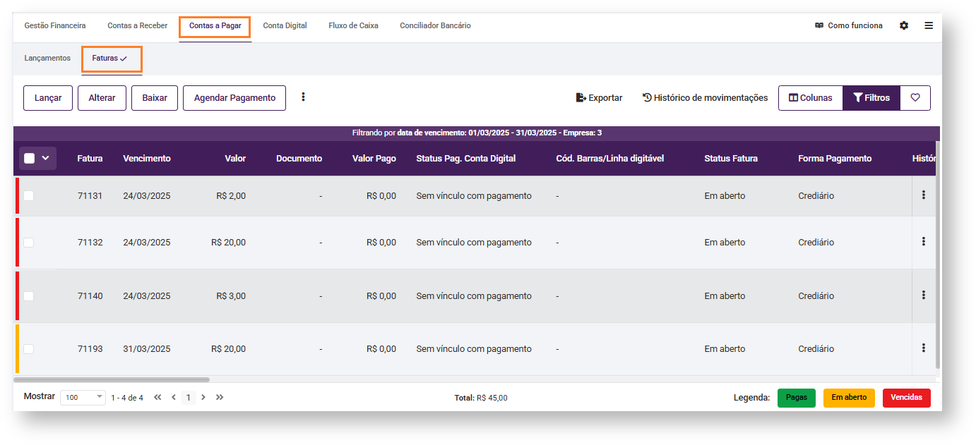 Nesta visão, são listadas as faturas do Contas a Pagar, com todos os recursos necessários para realizar as operações de lançar fatura, alterar, realizar baixa, agrupar, realizar negociação, excluir ou estornar, inserir anotações e anexos e ainda exibir os detalhes da fatura, e muito mais.
