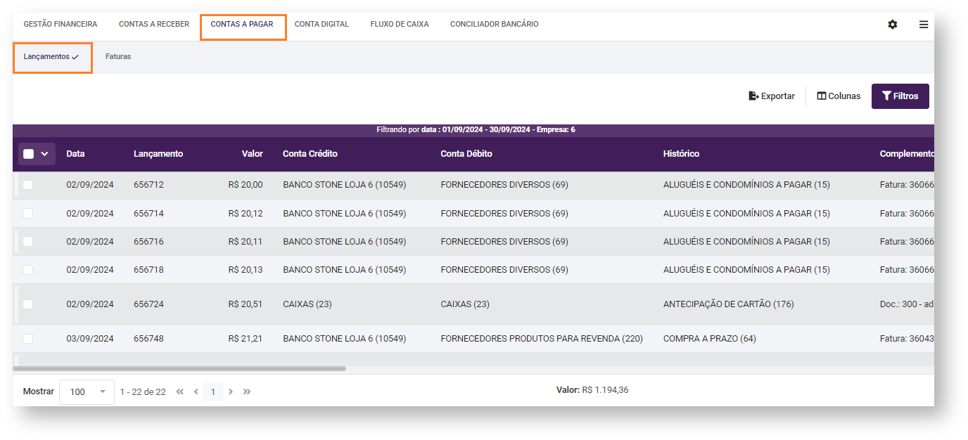 Para mais informações sobre a Visão de Lançamentos, acesse: Visão de Lançamentos - Contas a Pagar.