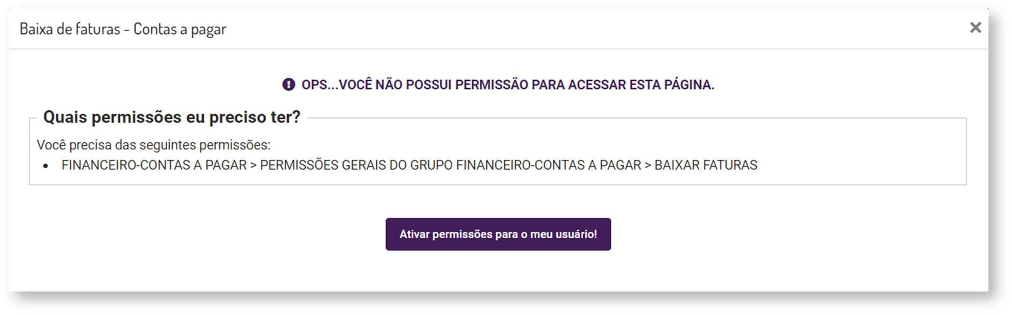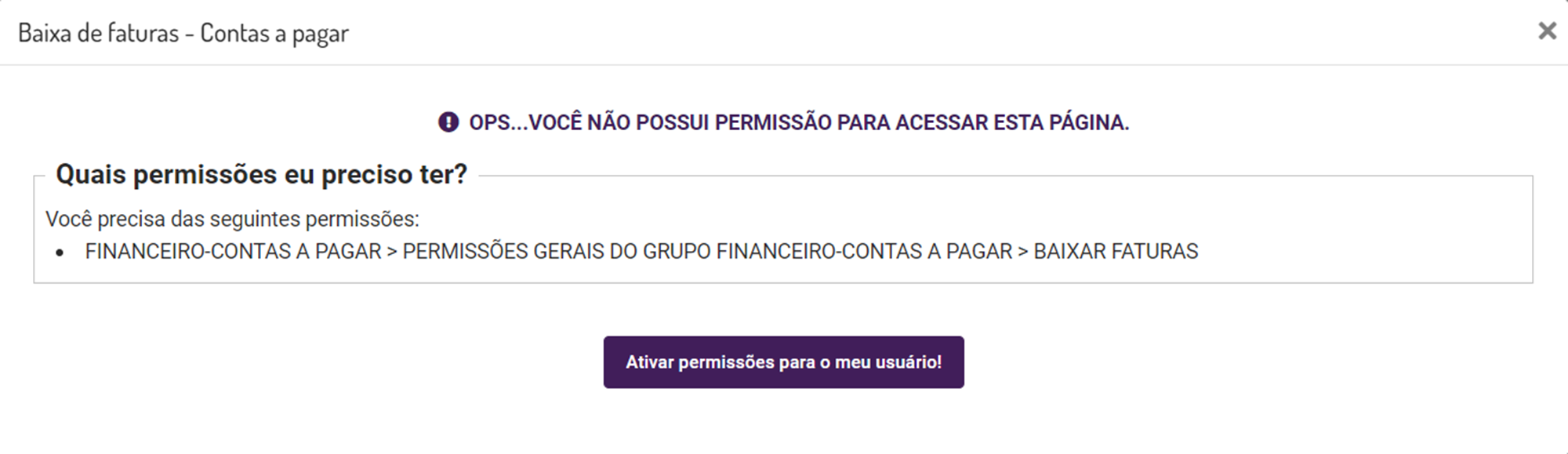 Neste caso, basta clicar no botão "ATIVAR PERMISSÕES PARA O MEU USUÁRIO!", que o sistema irá habilitar a permissão e prosseguirá direto para a operação com a fatura.