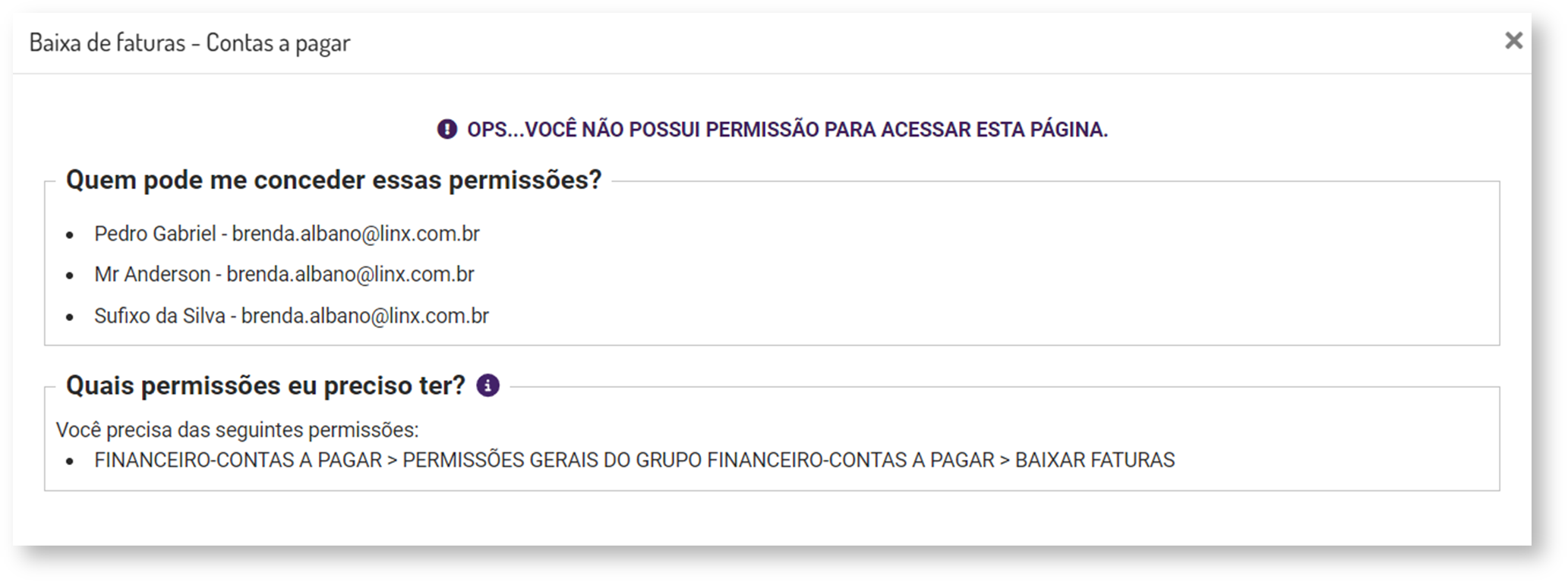 Tela de orientação para permissão de acesso da operação com as faturas, para Usuário Normal