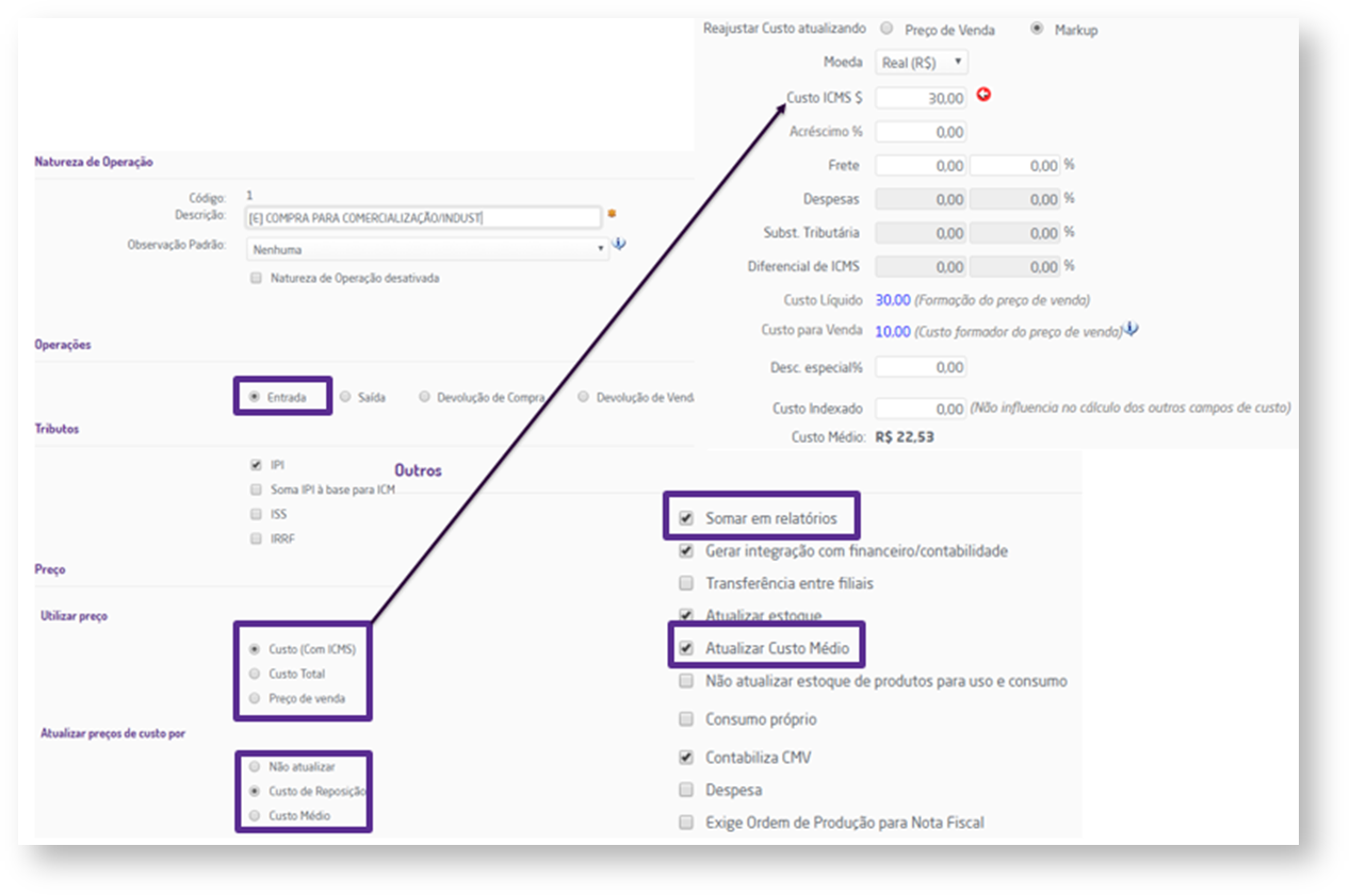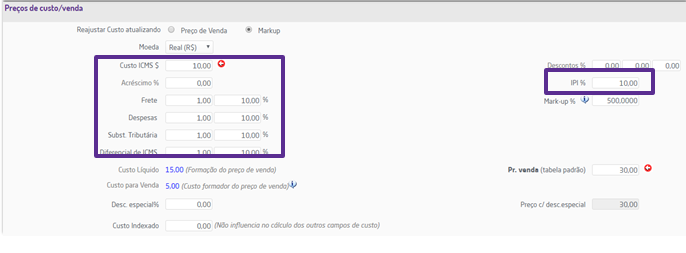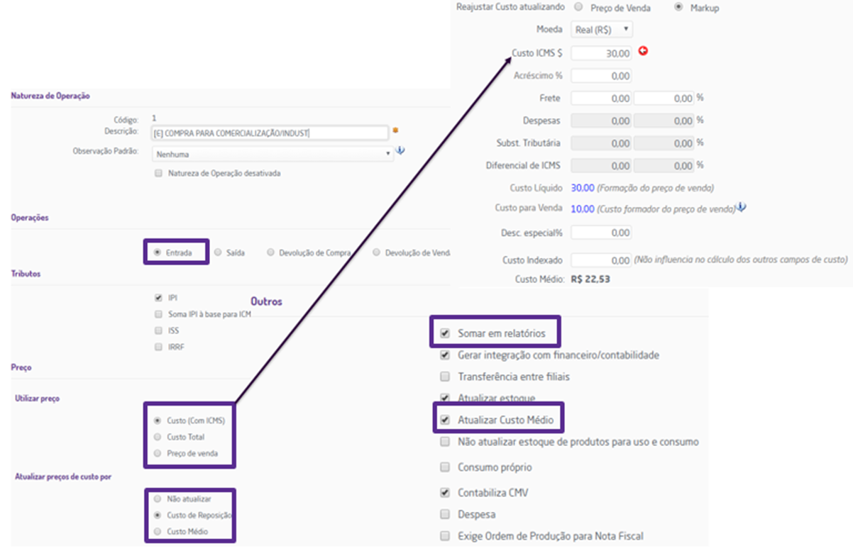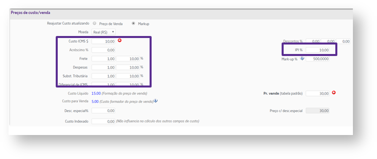 O Custo de aquisição é formado por um conjunto de fatores, que leva em consideração o Sistema de tributação da empresa, e mais algumas parametrizações conceituais que podem ser definidas