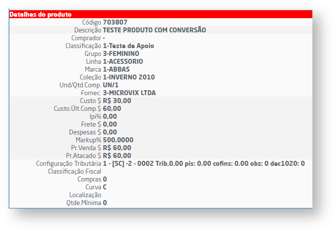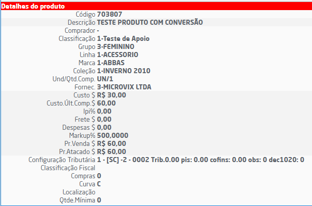 Podemos conferir sua composição dentro do cadastro do Produto, como no exemplo abaixo