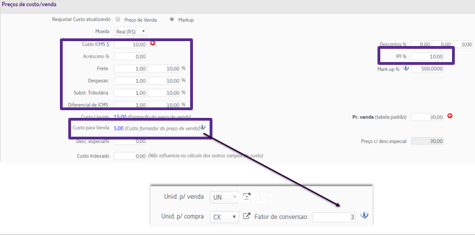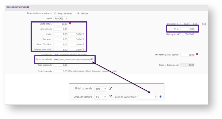 O Custo para a venda, é o total do custo liquido, dividido pelo fator de conversão configurado, caso tiver. Quando o produto não possui conversão, seu total será igual ao custo Liquido.