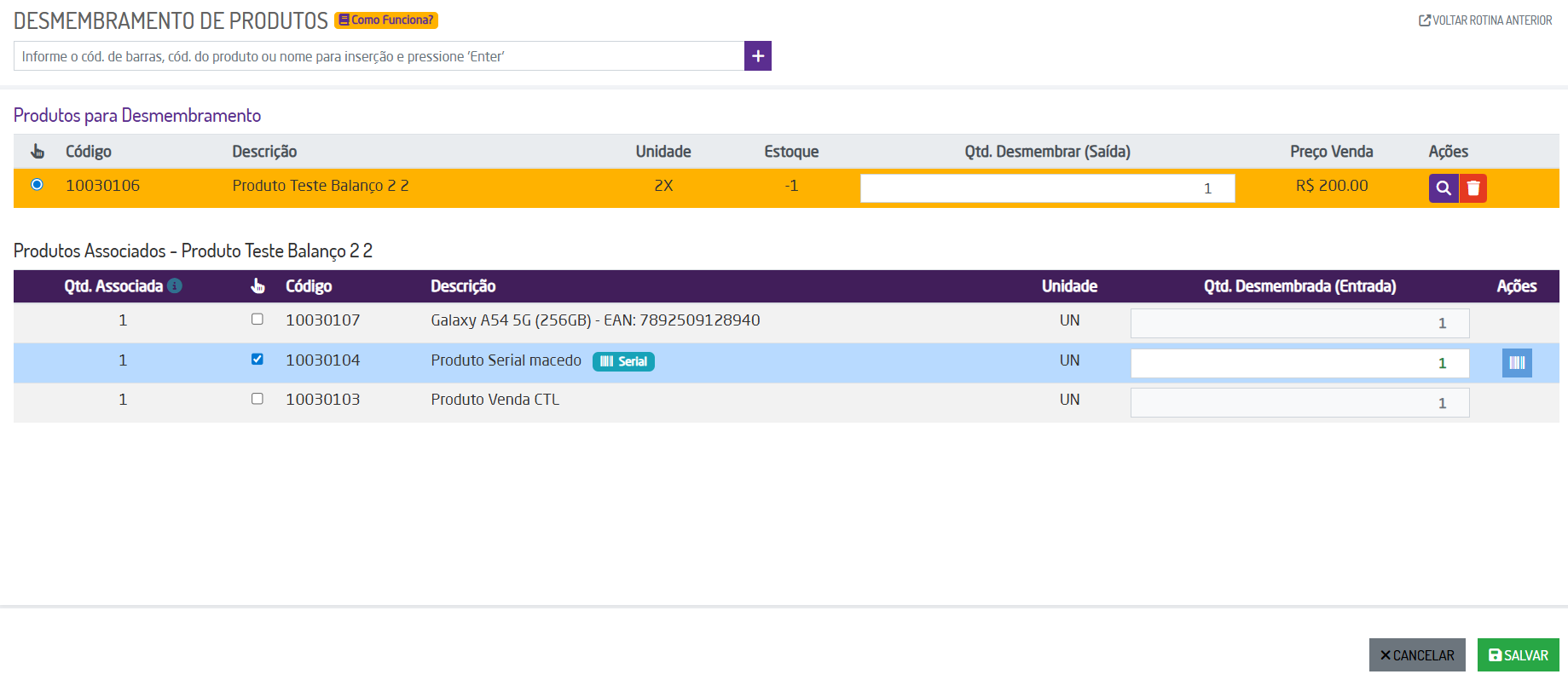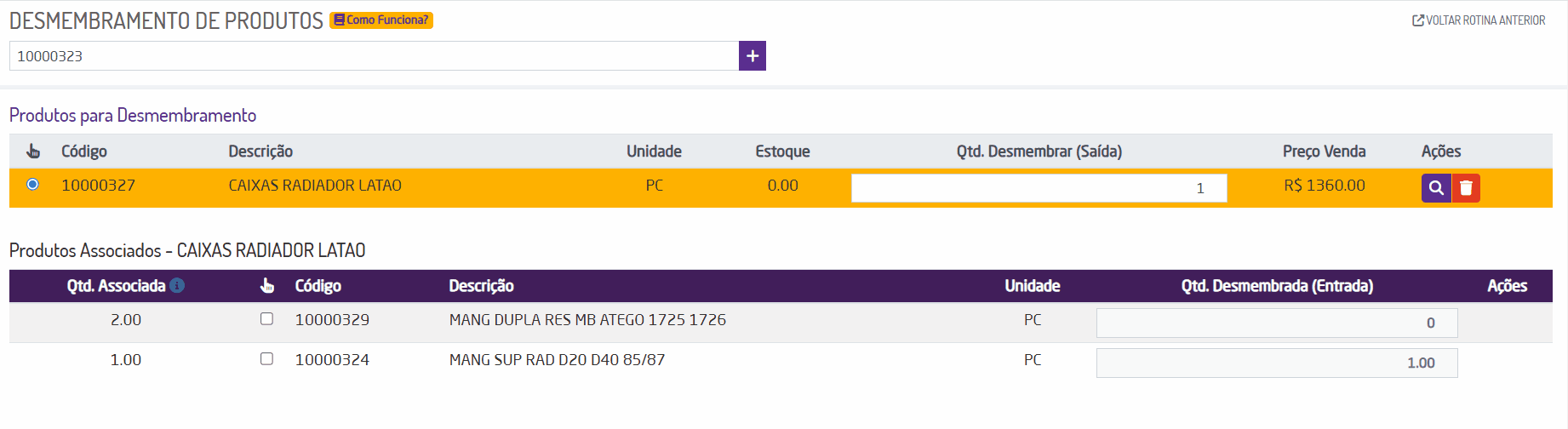 Caso o produto inserido tenha associações, será exibido na listagem para o desmembramento.