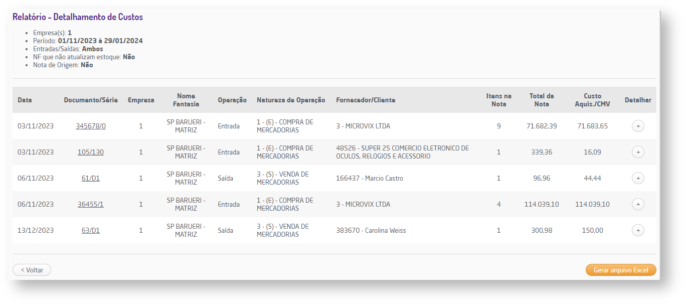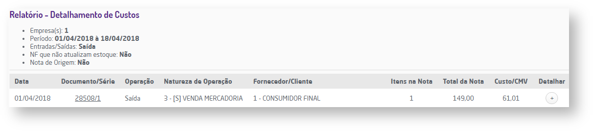 Após expandir as informações, através do botão da coluna "Detalhar" serão apresentados os custos do produto na nota fiscal, as colunas variam de acordo com o tipo de "Operação" da Natureza de Operação.