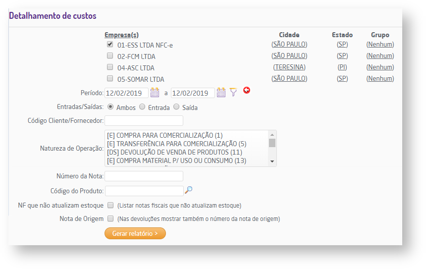 O relatório de Detalhamento de custos apresenta as informações referentes aos custos dos produtos contidos em uma nota fiscal. Será possível filtrar as informações desejadas através dos campos: Empresa, Período (data inicial e data final), Entradas e Saídas, Código do Cliente/Fornecedor, Natureza de Operação, Número da Nota, Código do Produto, NF que não atualizam estoque e Notas de Origem.