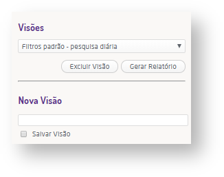 O recurso de visão permite que o usuário salve todos os filtros utilizados, ou seja, quando o usuário necessita gerar o relatório várias vezes com a mesma seleção de filtros, basta salvar uma visão e utilizá-la toda vez que for preciso. A visão funciona da seguinte forma: