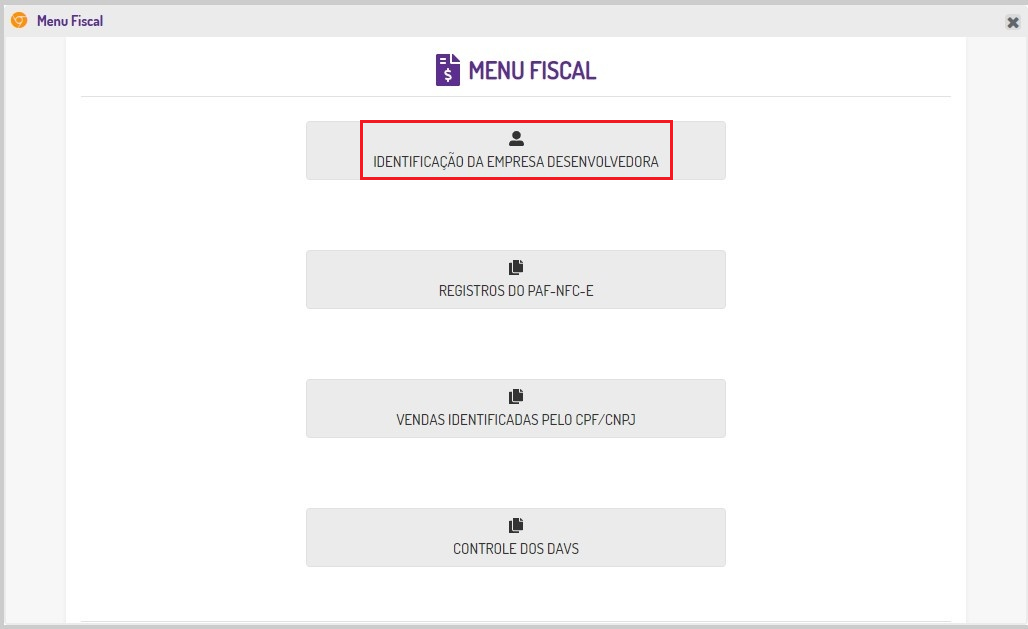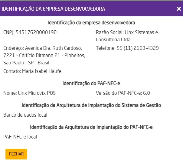 Através desta rotina será possível visualizar as informações da empresa desenvolvedora. Desta forma o usuário poderá conferir as informações que são impressas no PAF quando realizar a impressão de um comprovante não fiscal.