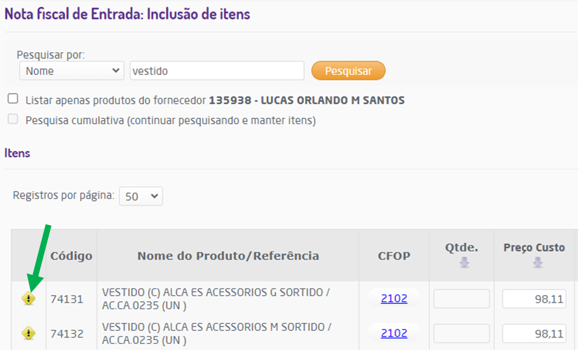 Quando o produto adicionado por meio do botão "Inserir Itens", será aberta a listagem do(s) produto(s) pesquisados na busca e o(s) que tiver(em) alguma inconsistência de dados tributários, terão um ícone logo em frente a linha, que informando tal fato. conforme a figura abaixo: